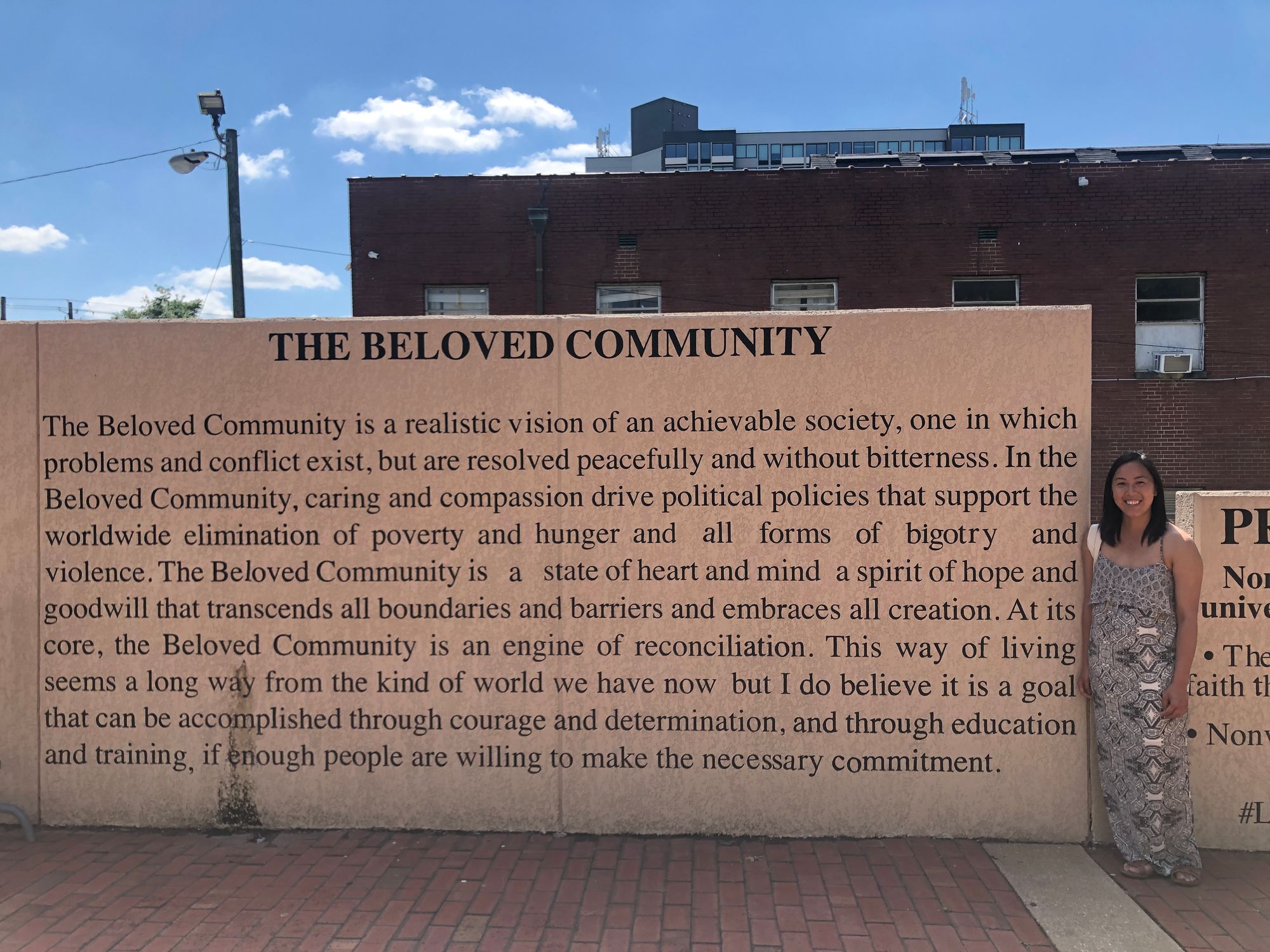 I was fortunate to be in Atlanta, Georgia, recently and to stumble upon Martin Luther King Jr.’s old church, Ebenezer Baptist Church, where both he and his father were pastors. Nearby, MLK’s nonviolence principles and his vision for the Beloved Community were painted on the walls. I want to share a few lines: