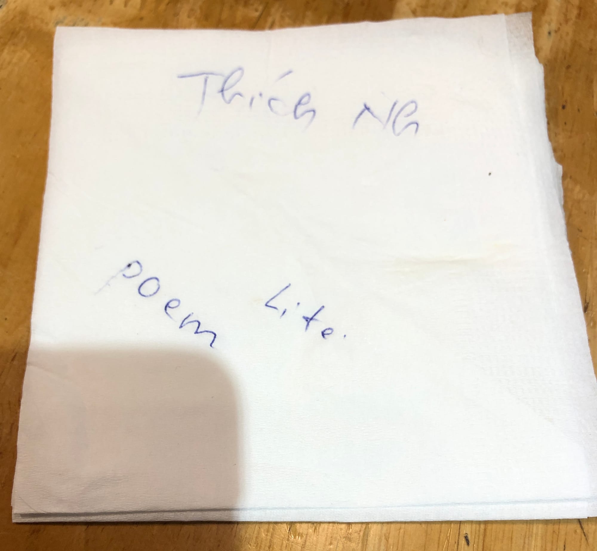returns with the word ‘poem’ on a napkin in blue ink