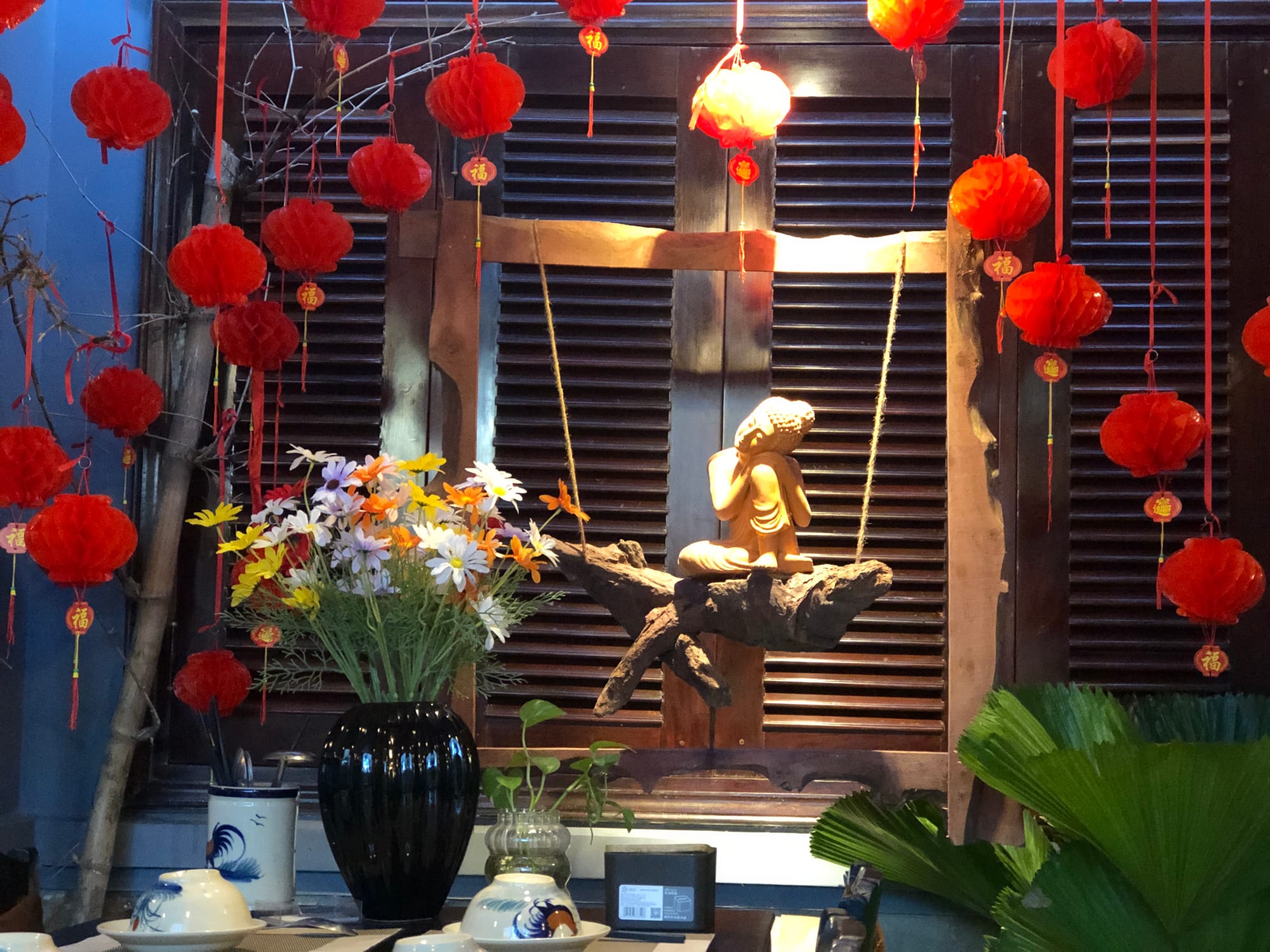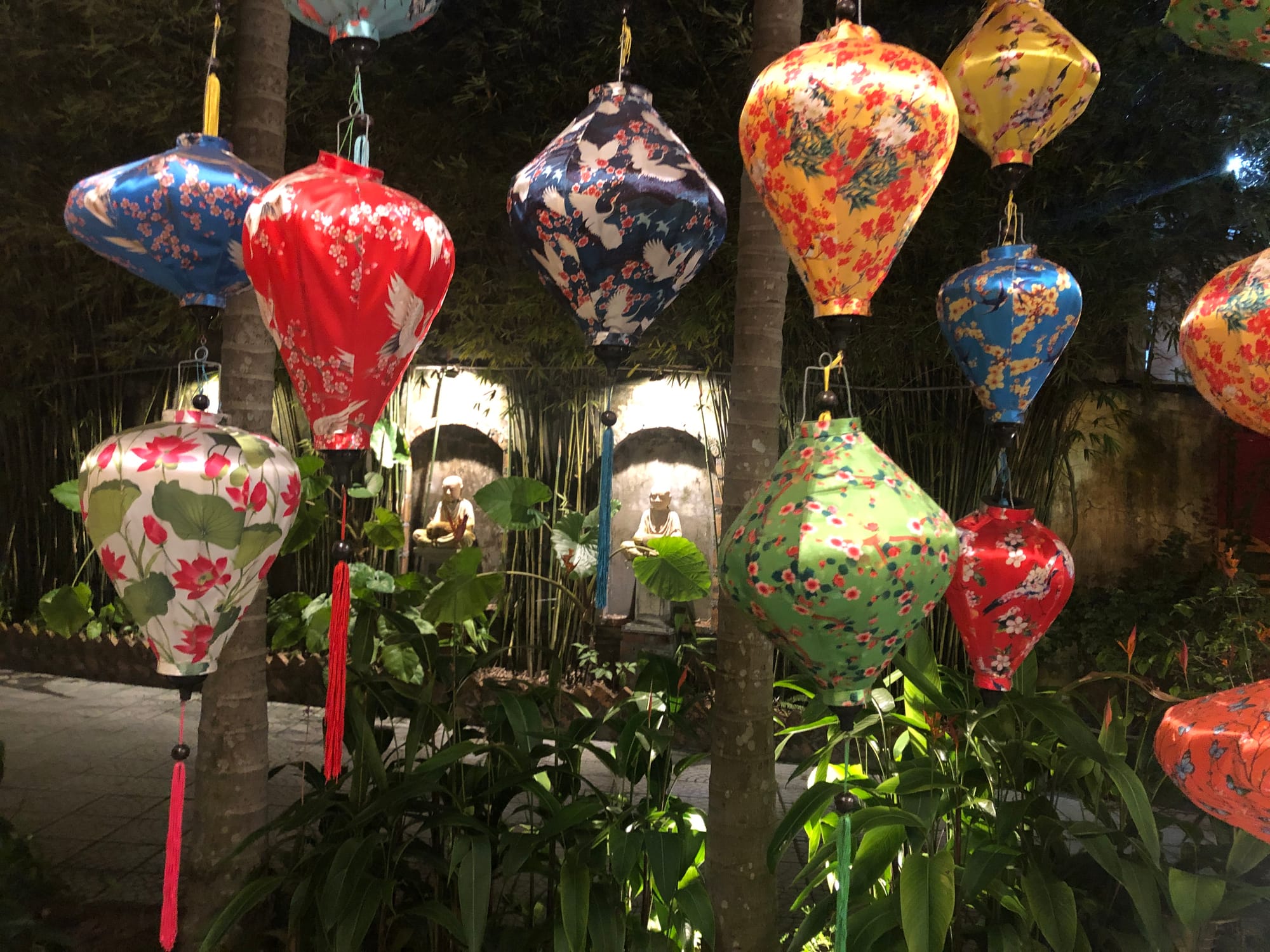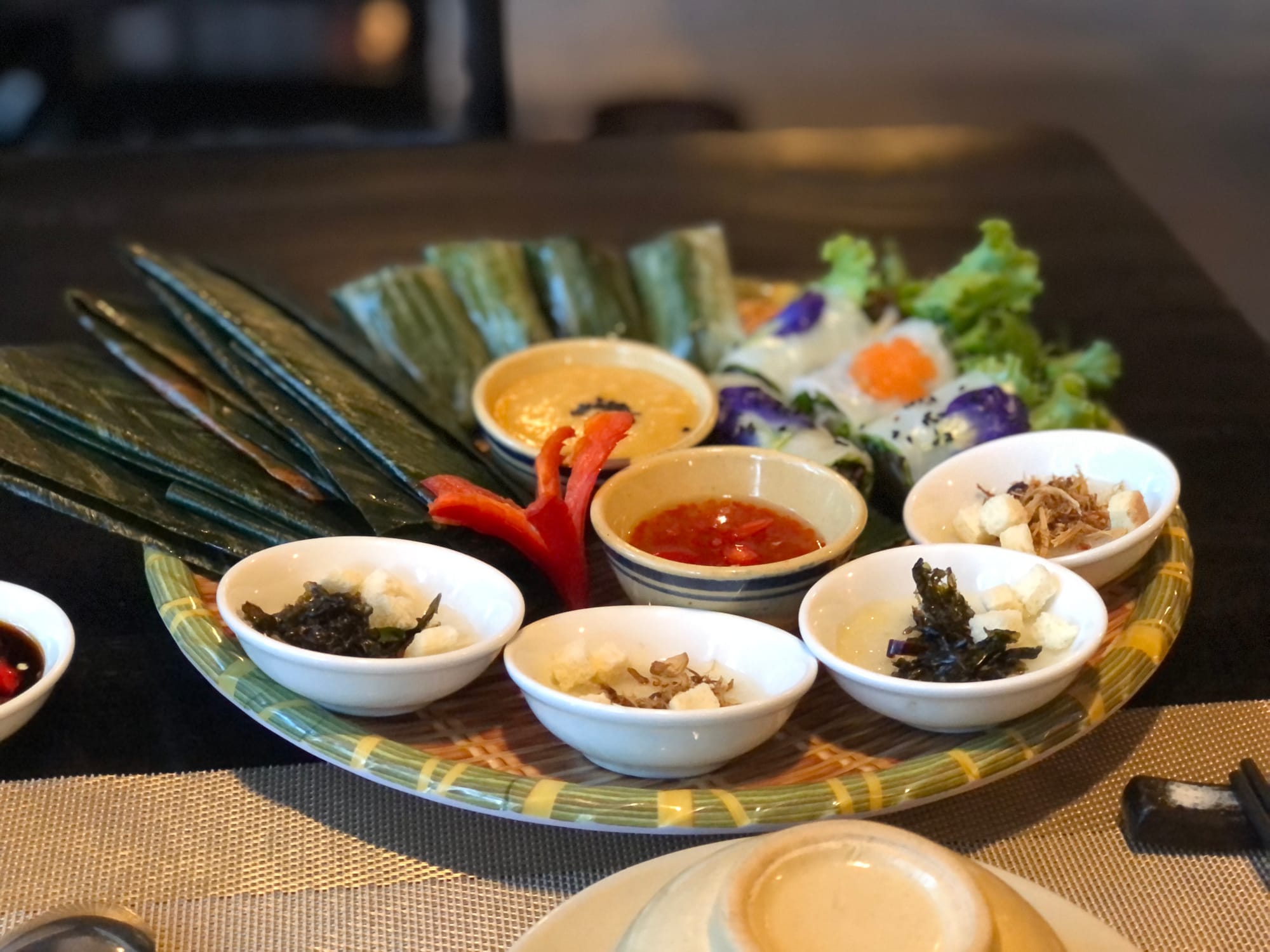 I stumbled upon a marvelous vegetarian restaurant (Tinh Garden) not far from my hostel, with exquisite decor and very kind staff. I ordered a special platter of savory rice cakes - one kind wrapped in dark green banana leaves, another in smaller leaves, yet another molded into tiny cups & topped with seaweed and dried mushroom. It was light, delicious, and fun to unfold leaves, revealing purple tofu and mushroom, or chewy rice, carrot, and mushroom. As dusk arrived, so did the too-friendly mosquitoes — I walked away with 15+ itchy bites and a beautiful memory of amazing vegetarian cuisine.