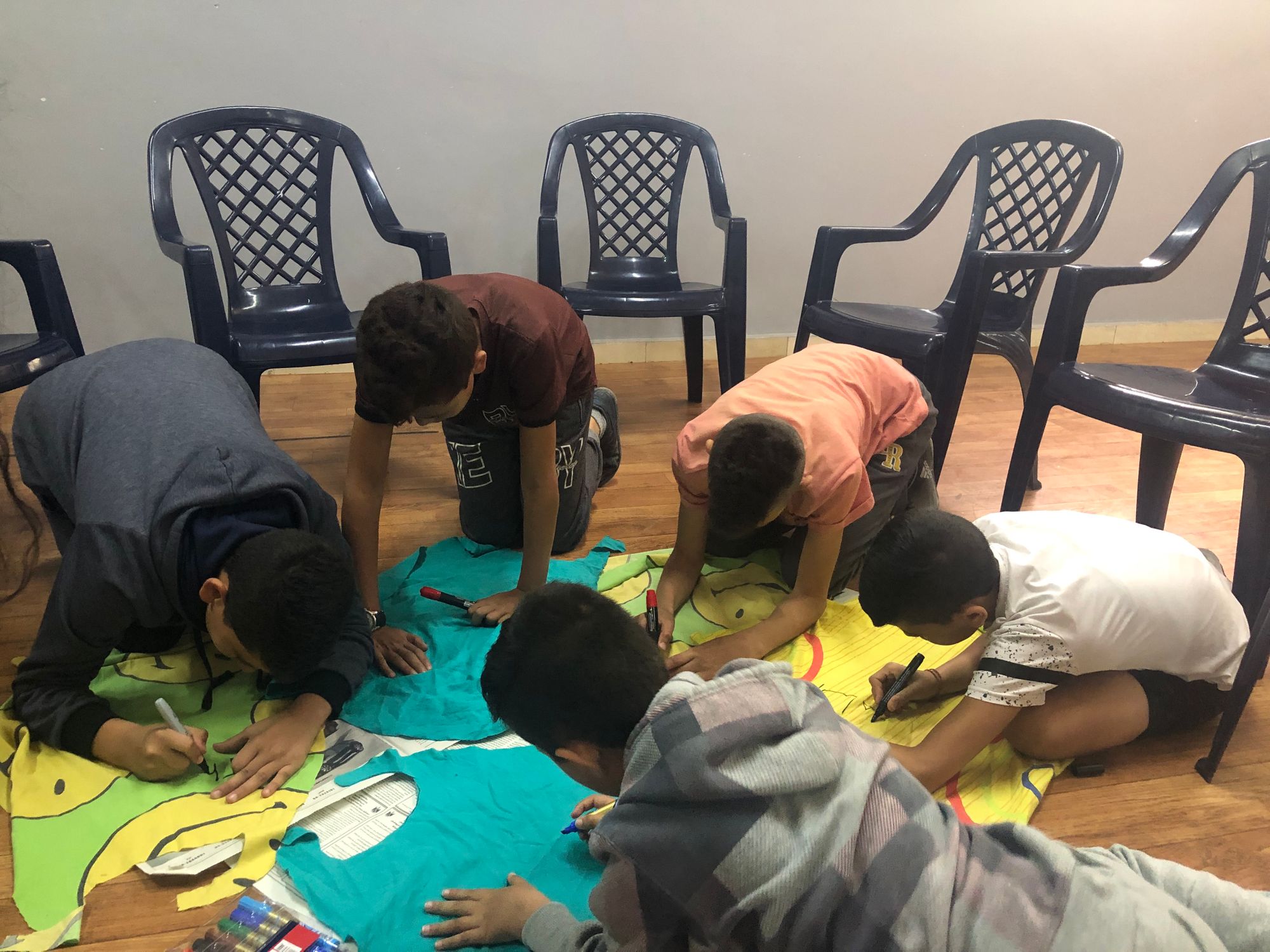 A few minutes later, Ali showed up sans key. We called Sophie, our other translator, and her dad drove her within minutes with a key to another door — his NGO was across the hall from Shoruq and we could use his kitchen. The space was beautiful and dusty, and we wiped the tabletops down before the kids claimed their chairs.