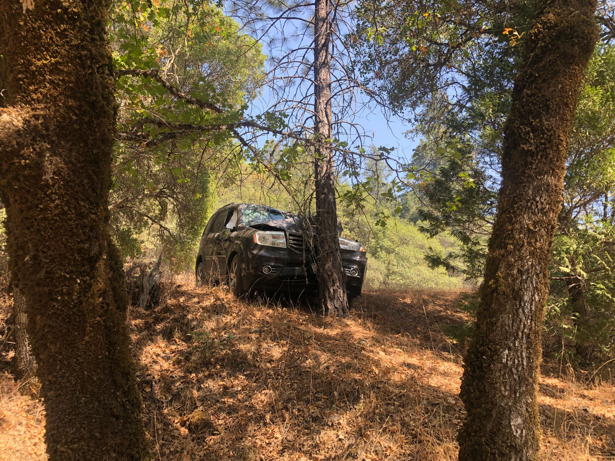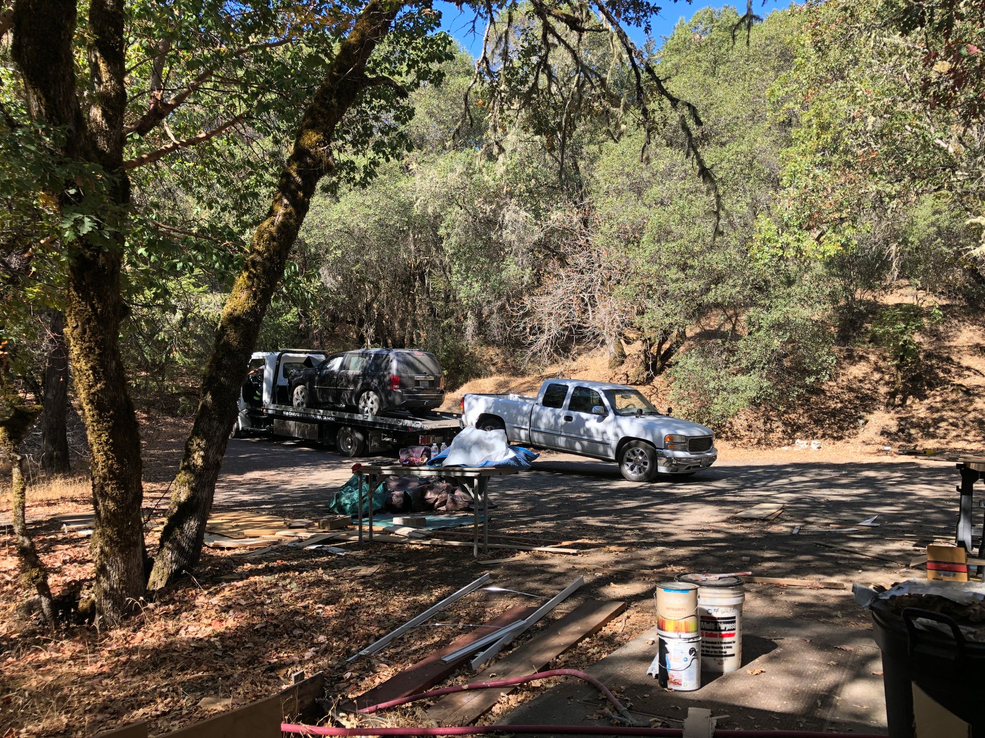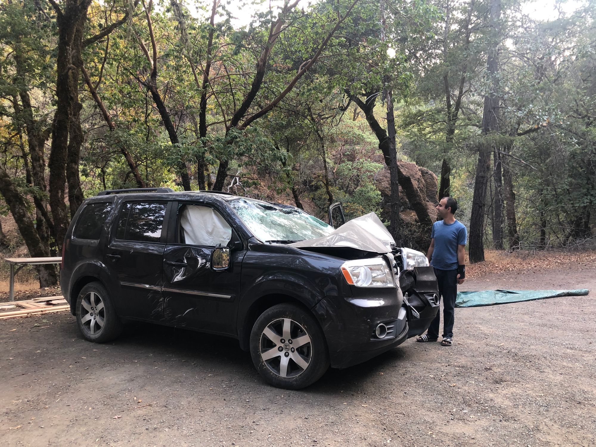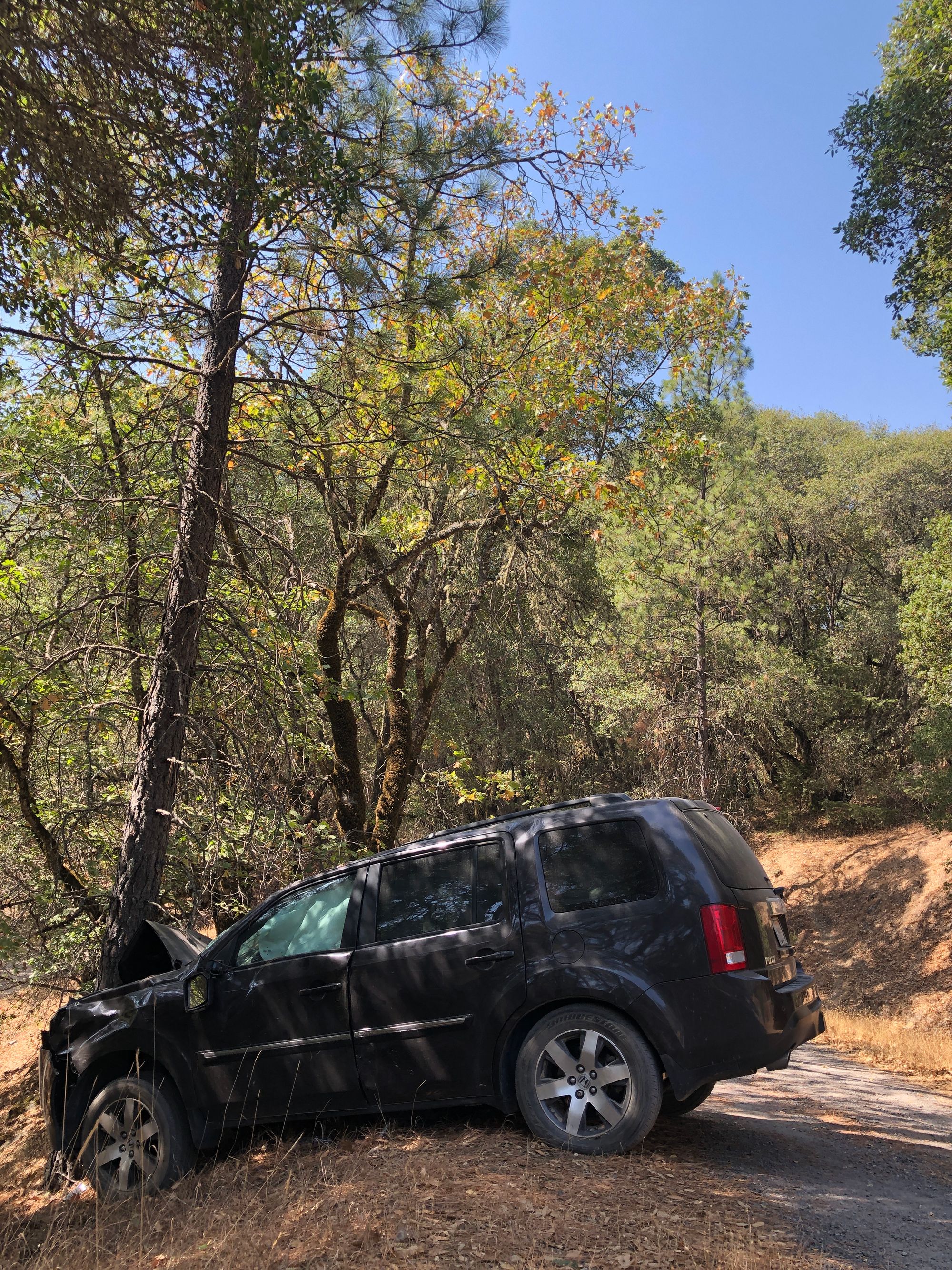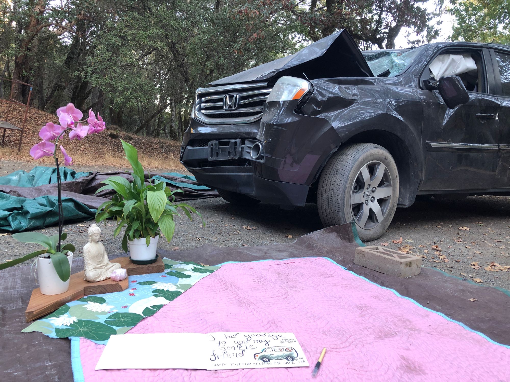I sold my wrecked car (still at Mariposa) to Copart for $2,200. The day before the tow truck came, I held a quiet ceremony in the shadow of the great trees and the soft singing of the wind. And on Tuesday, October 21, a kind and reliable driver came to pick up my car. I kept the front license plate, the metal warped from impact.